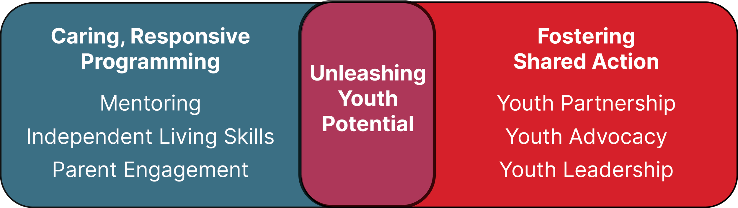 Caring, trusted relationships are at the core of all of our work with youth. Specifically, we support youth by connecting them with caring adult mentors and growing their social-emotional and independent living skills.